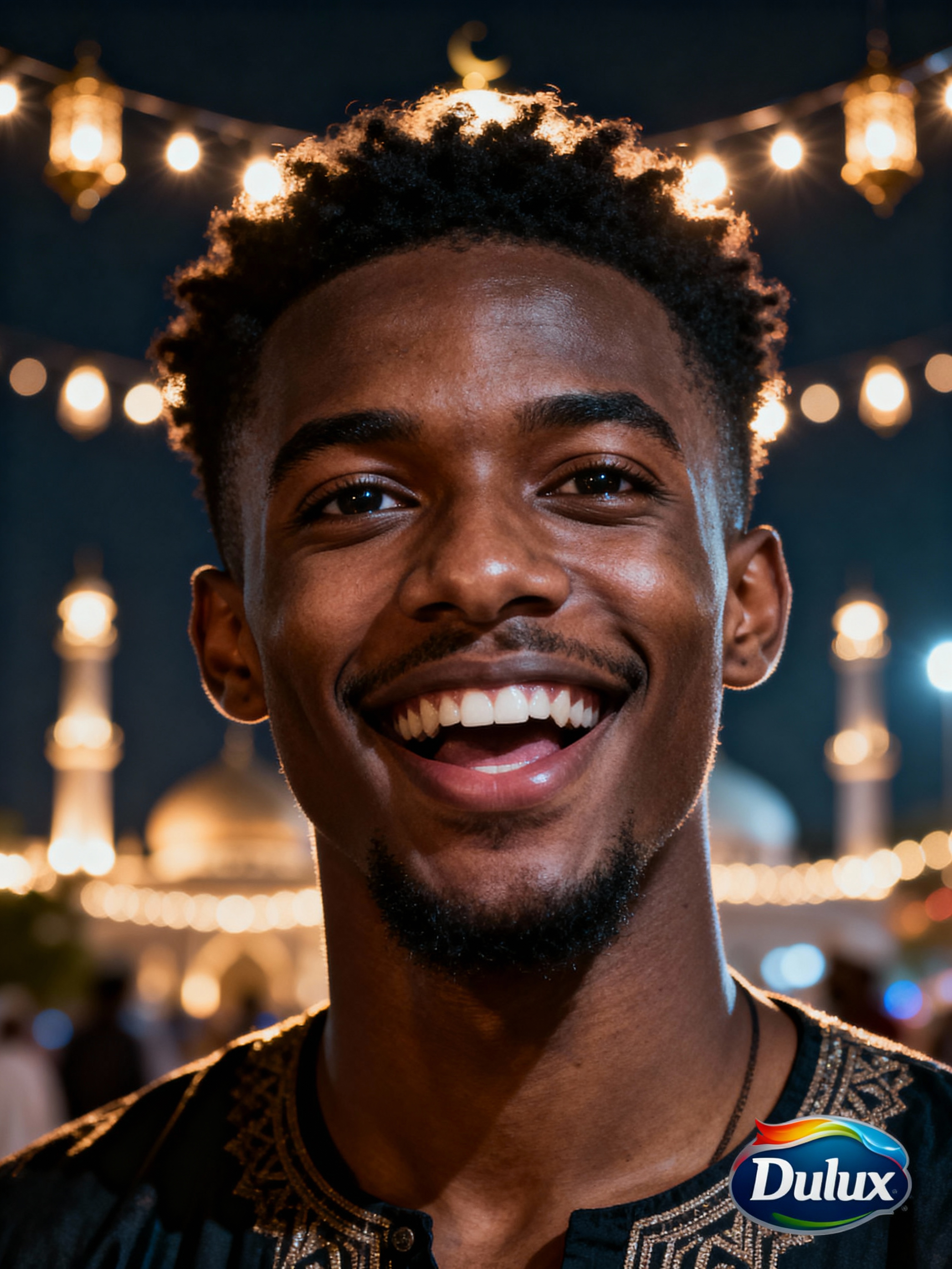 a model with face with a joyful expression in the glow of Eid lights, capturing the happiness that defines this blessed holiday