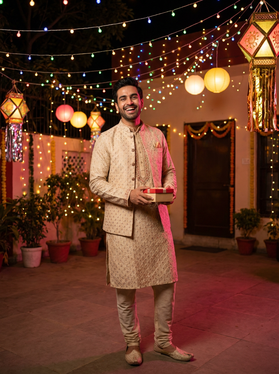 a model with face with a joyful expression in the glow of Eid lights, capturing the happiness that defines this blessed holiday