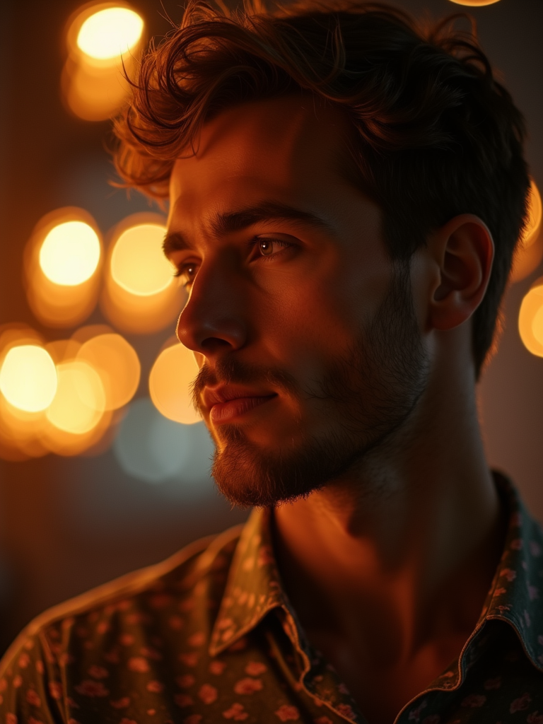 a model with face with a peaceful expression in the glow of Ramadan lights, capturing the spiritual reflection that defines this holy month