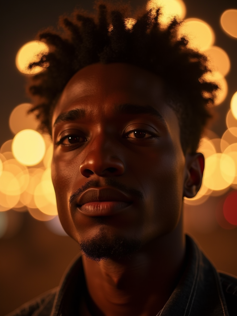 a model with face with a peaceful expression in the glow of Ramadan lights, capturing the spiritual reflection that defines this holy month