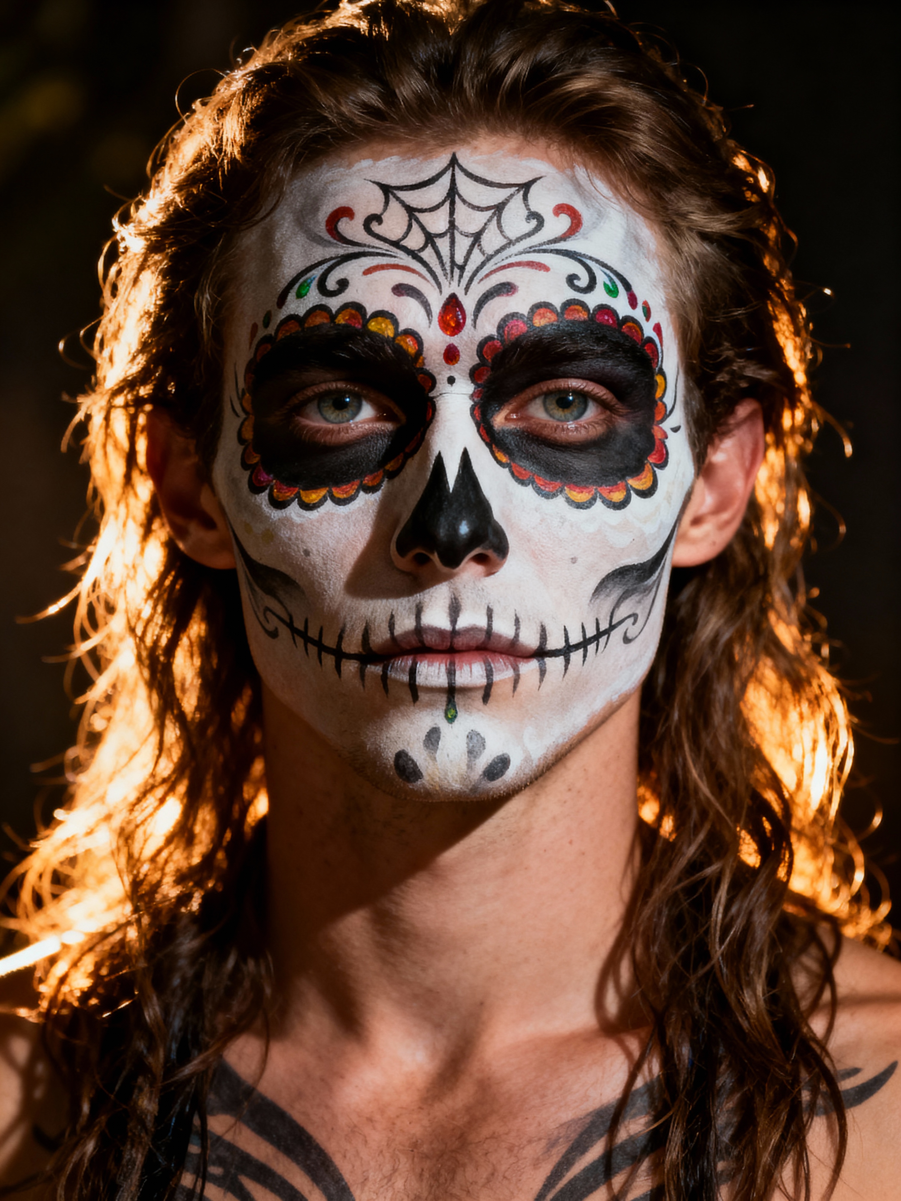 a model with face with elegant sugar skull painting, capturing the duality of life and death that defines this important cultural celebration
