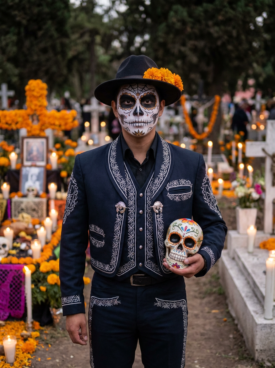 a model with face with elegant sugar skull painting, capturing the duality of life and death that defines this important cultural celebration