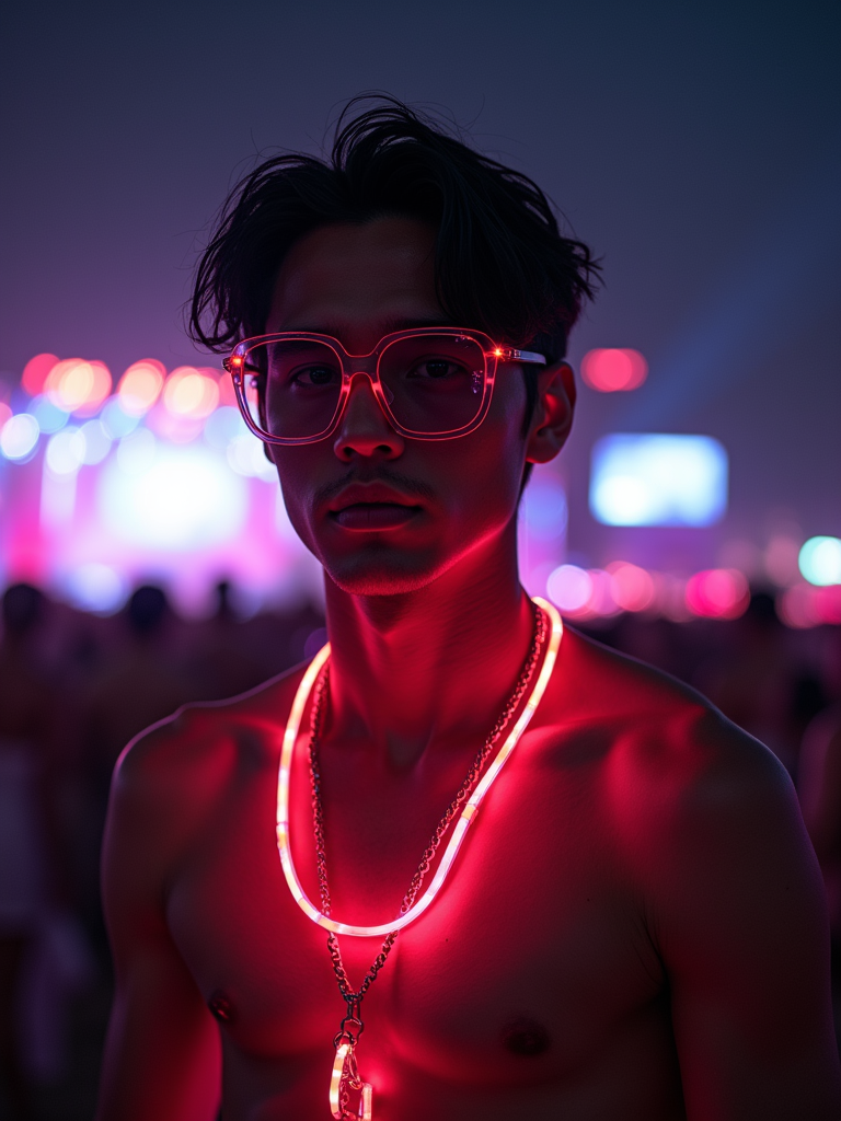 a model with glowing LED accessories, standing out in the Coachella crowd at night with stage lights illuminating the scene