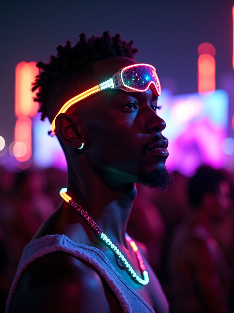 a model with glowing LED accessories, standing out in the Coachella crowd at night with stage lights illuminating the scene