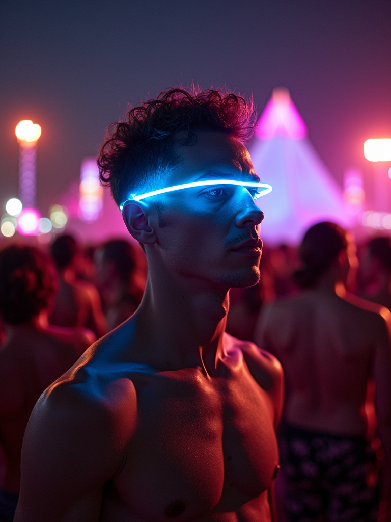 a model with glowing LED accessories, standing out in the Coachella crowd at night with stage lights illuminating the scene