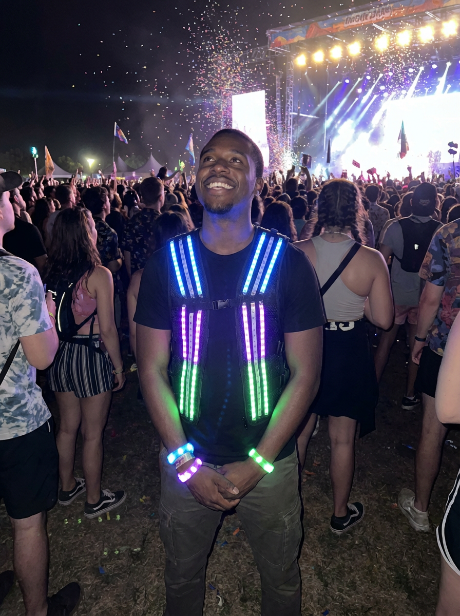 a model with glowing LED accessories, standing out in the crowd and embracing the festival's vibrant atmosphere