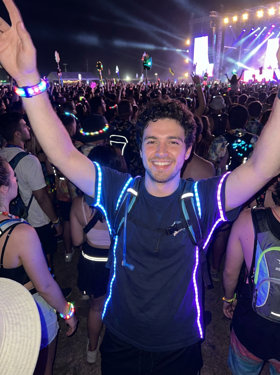 a model with glowing LED accessories, standing out in the crowd and embracing the festival's vibrant atmosphere