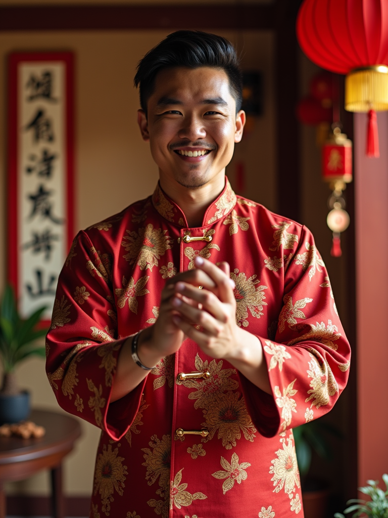 a model with hands arranging lucky decorations, standing out in a beautifully decorated home with red and gold ornaments and Chinese calligraphy