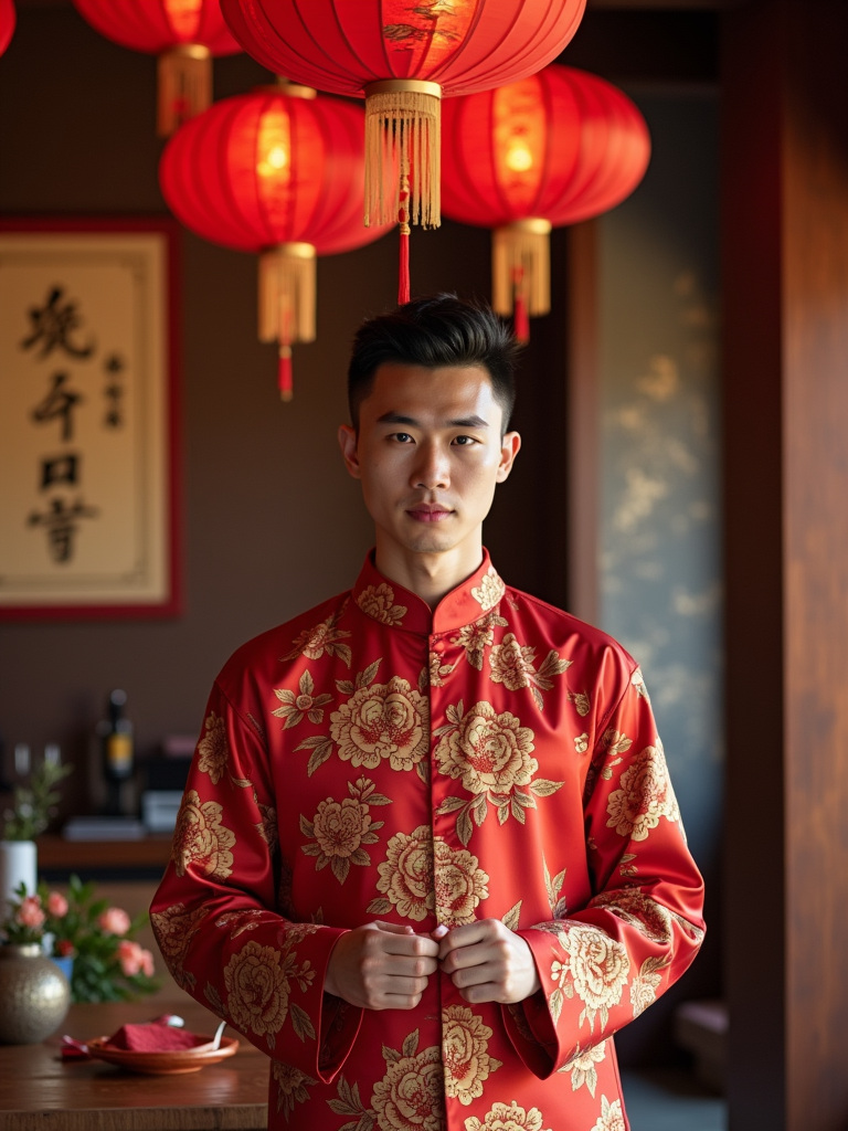 a model with hands arranging lucky decorations, standing out in a beautifully decorated home with red and gold ornaments and Chinese calligraphy