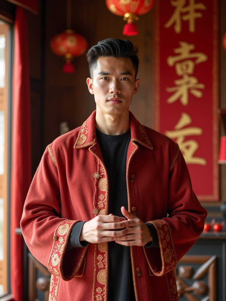 a model with hands arranging lucky decorations, standing out in a beautifully decorated home with red and gold ornaments and Chinese calligraphy