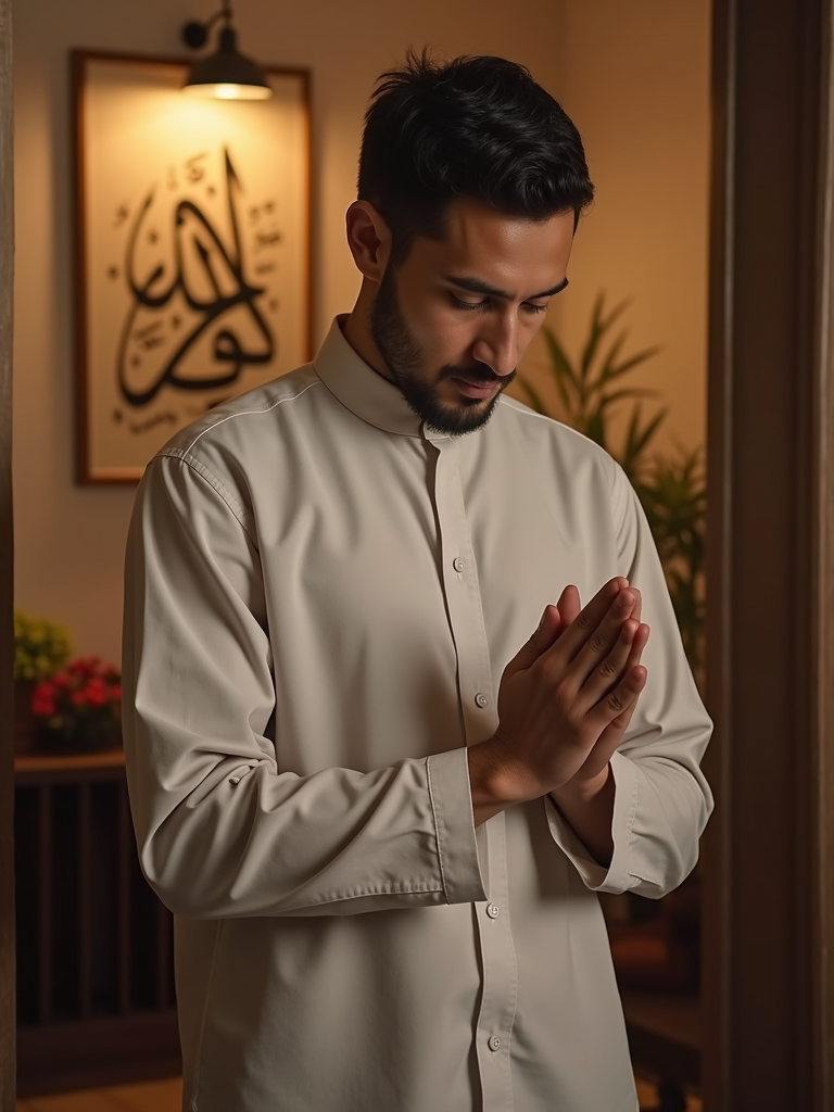 a model with hands greeting family members, standing out in a beautifully decorated home with soft lighting and Islamic calligraphy