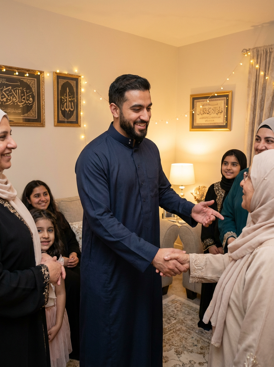 a model with hands greeting family members, standing out in a beautifully decorated home with soft lighting and Islamic calligraphy