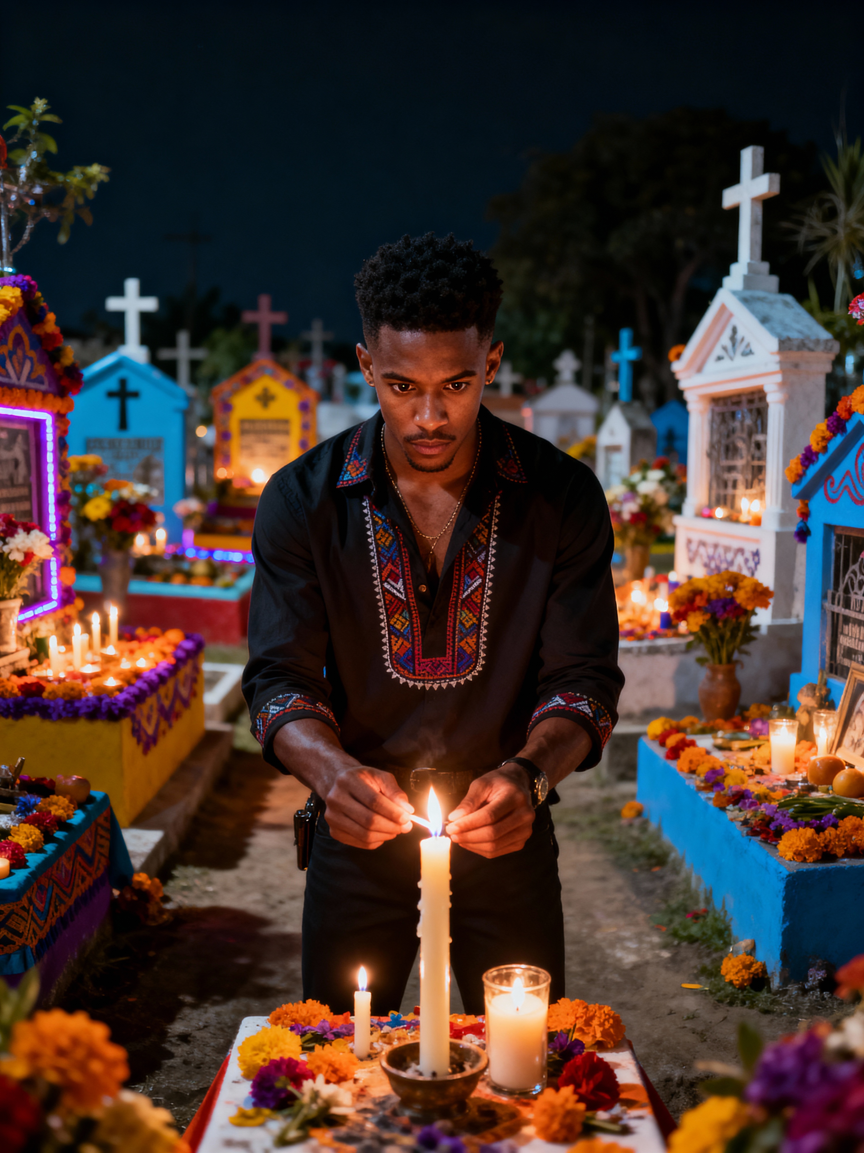 a model with hands lighting candles on an altar, standing out in a beautifully decorated cemetery with colorful graves and offerings