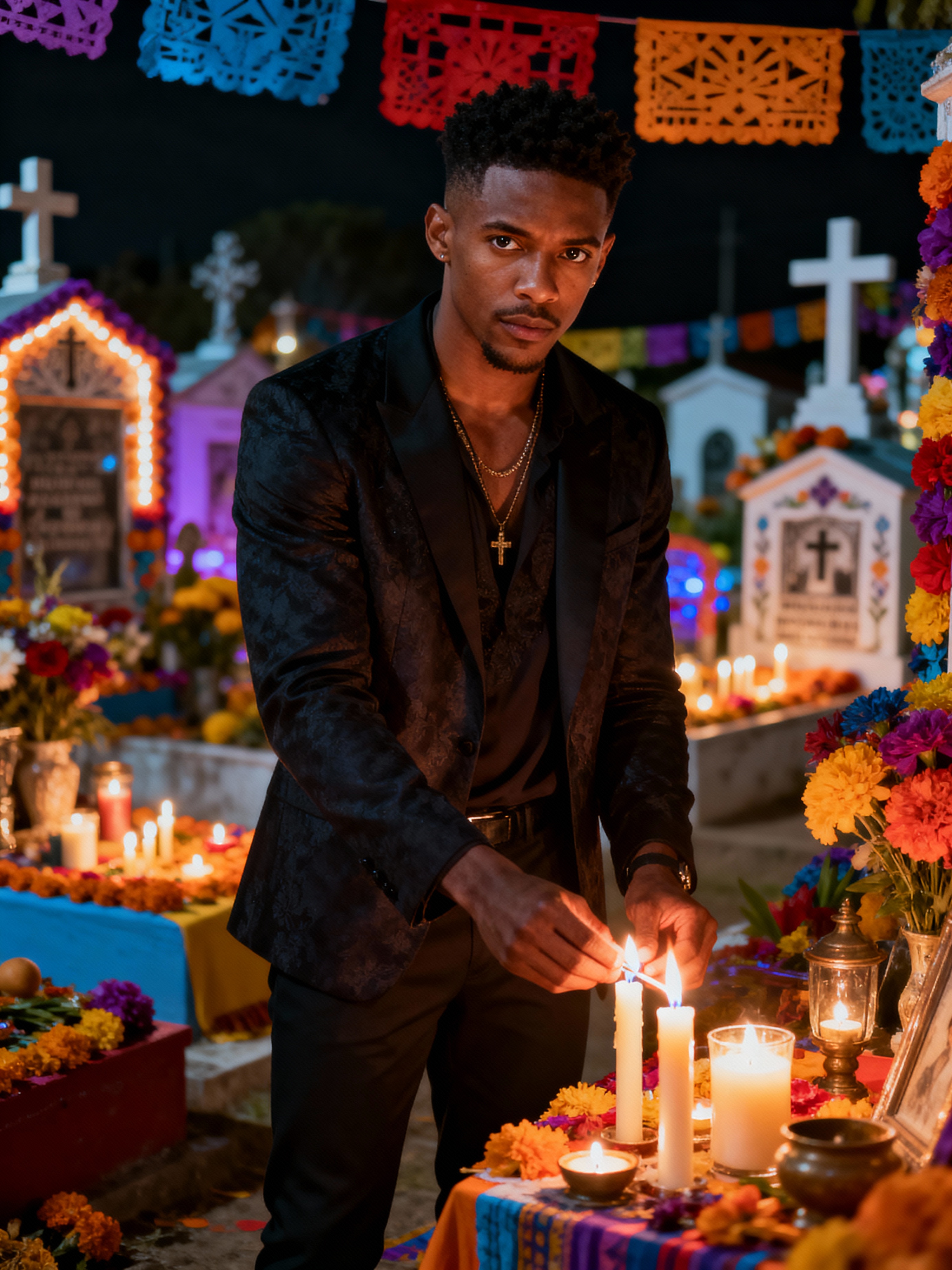 a model with hands lighting candles on an altar, standing out in a beautifully decorated cemetery with colorful graves and offerings