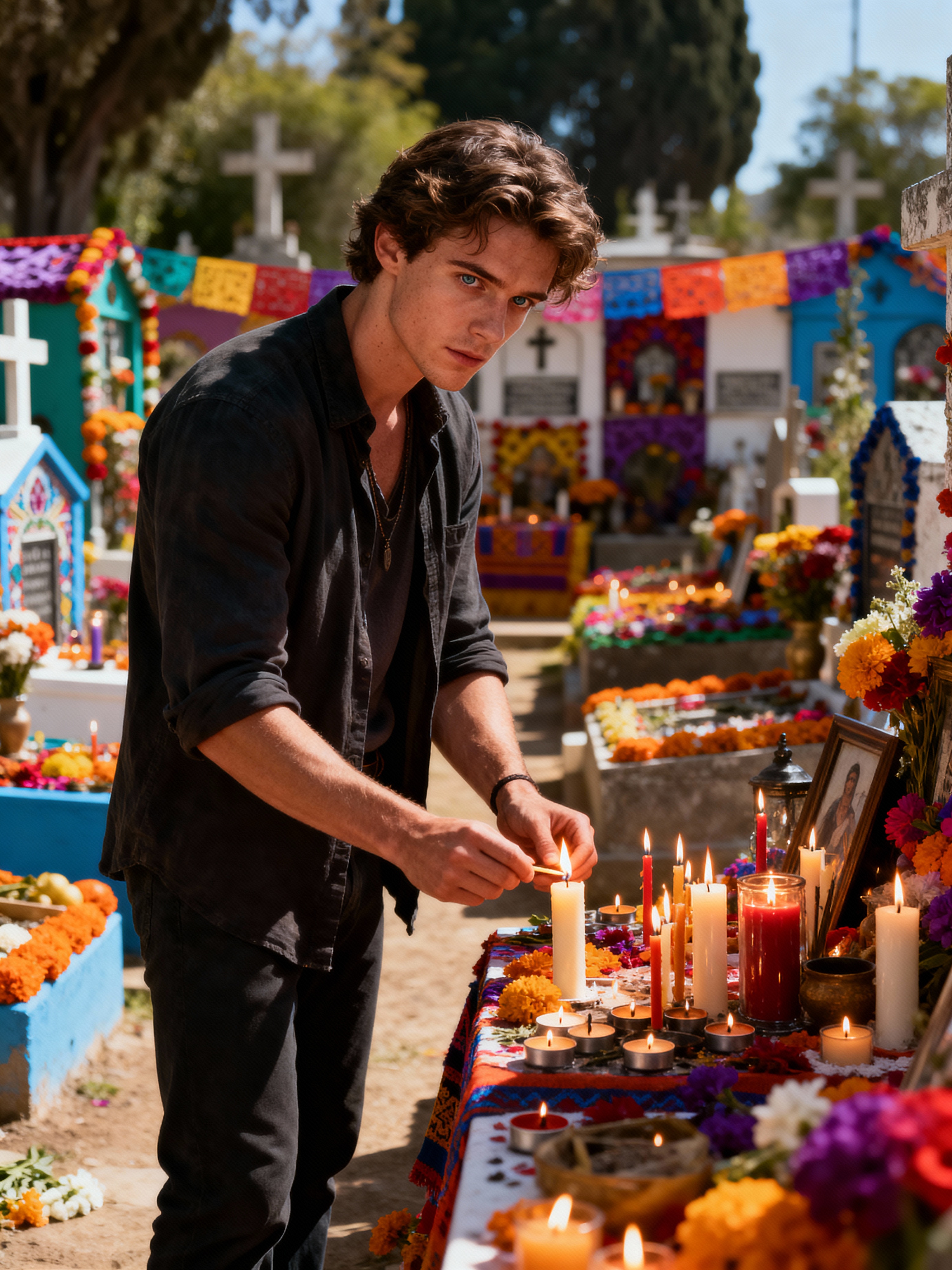 a model with hands lighting candles on an altar, standing out in a beautifully decorated cemetery with colorful graves and offerings