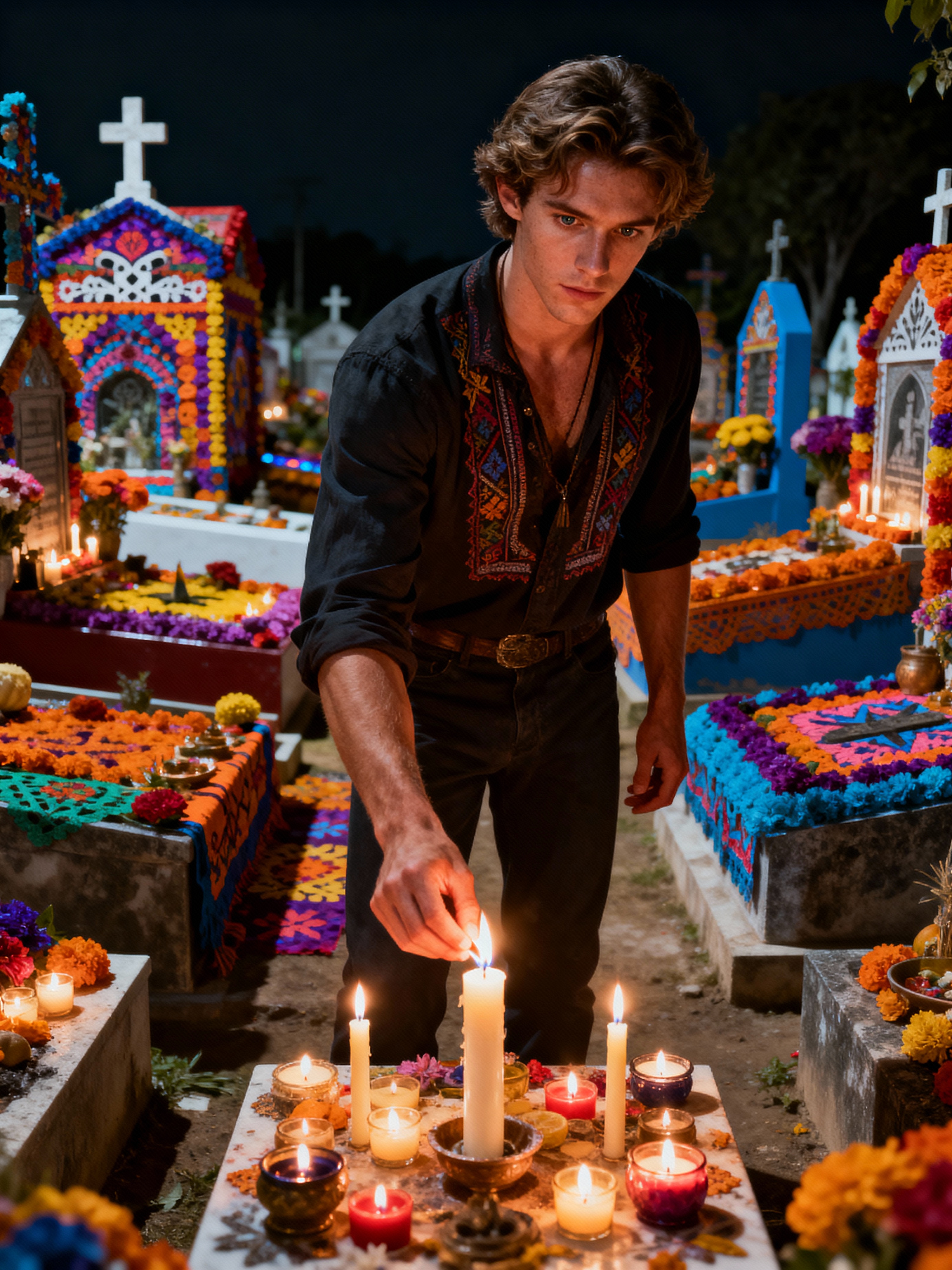 a model with hands lighting candles on an altar, standing out in a beautifully decorated cemetery with colorful graves and offerings
