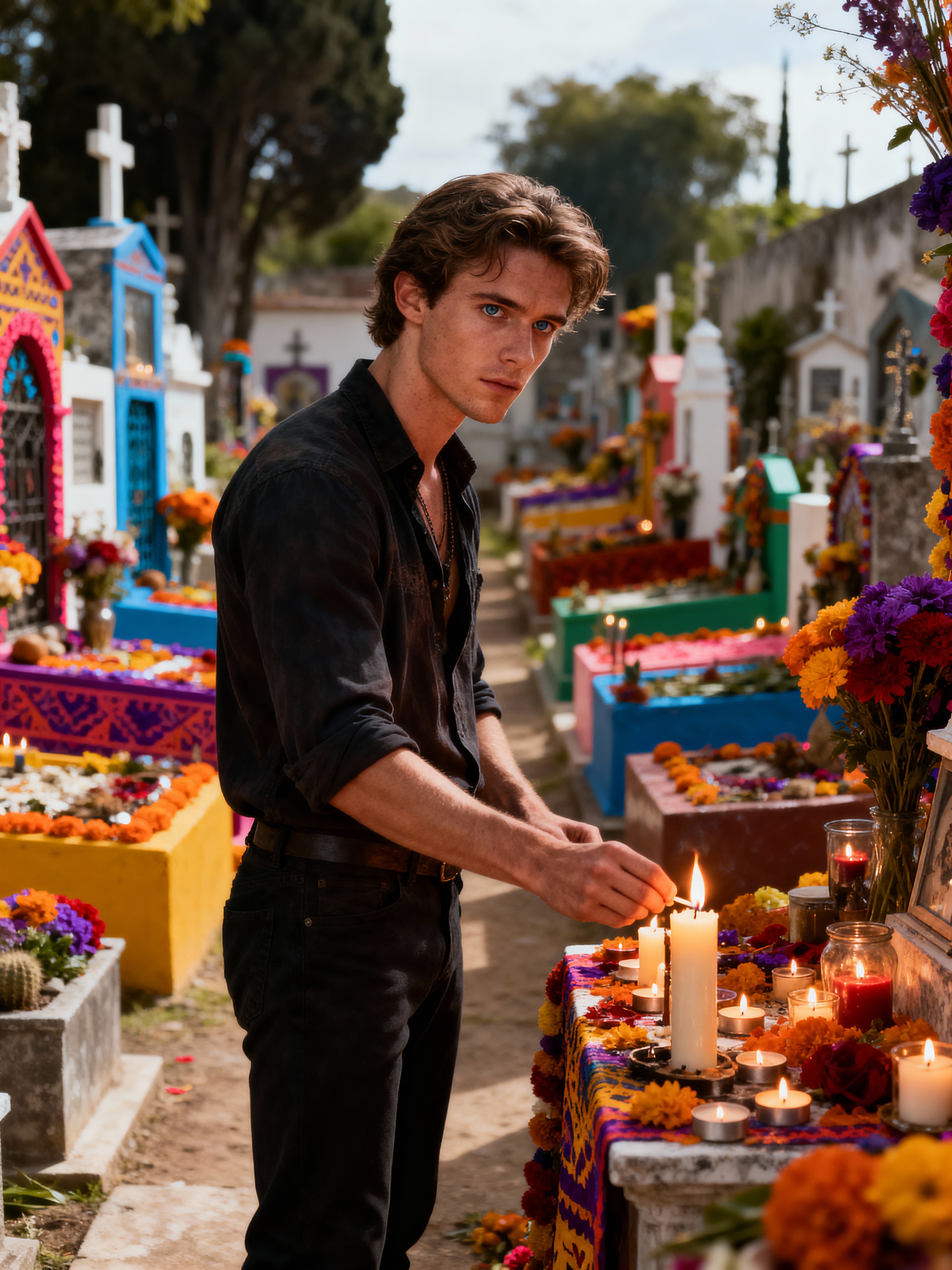 a model with hands lighting candles on an altar, standing out in a beautifully decorated cemetery with colorful graves and offerings