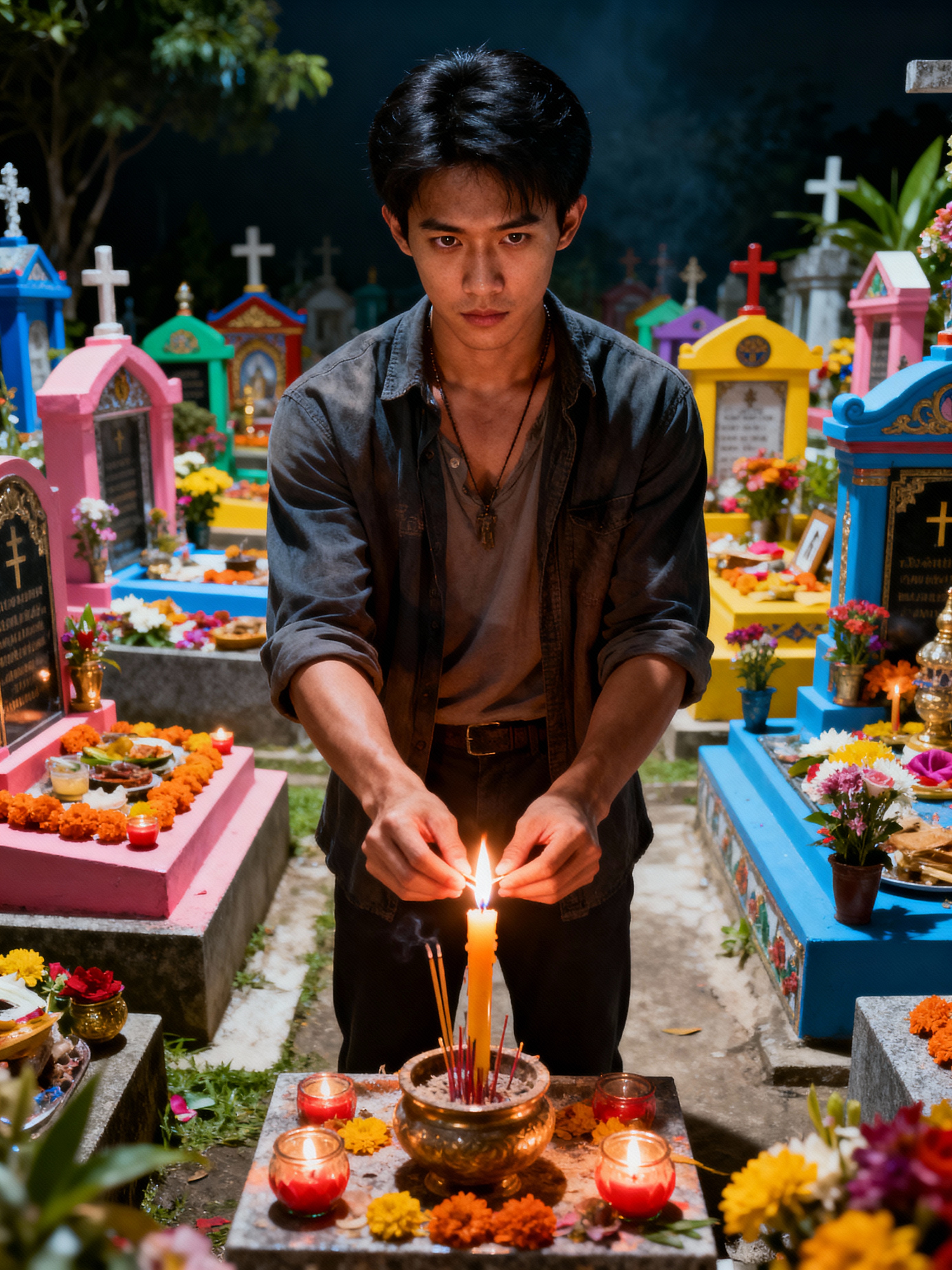 a model with hands lighting candles on an altar, standing out in a beautifully decorated cemetery with colorful graves and offerings