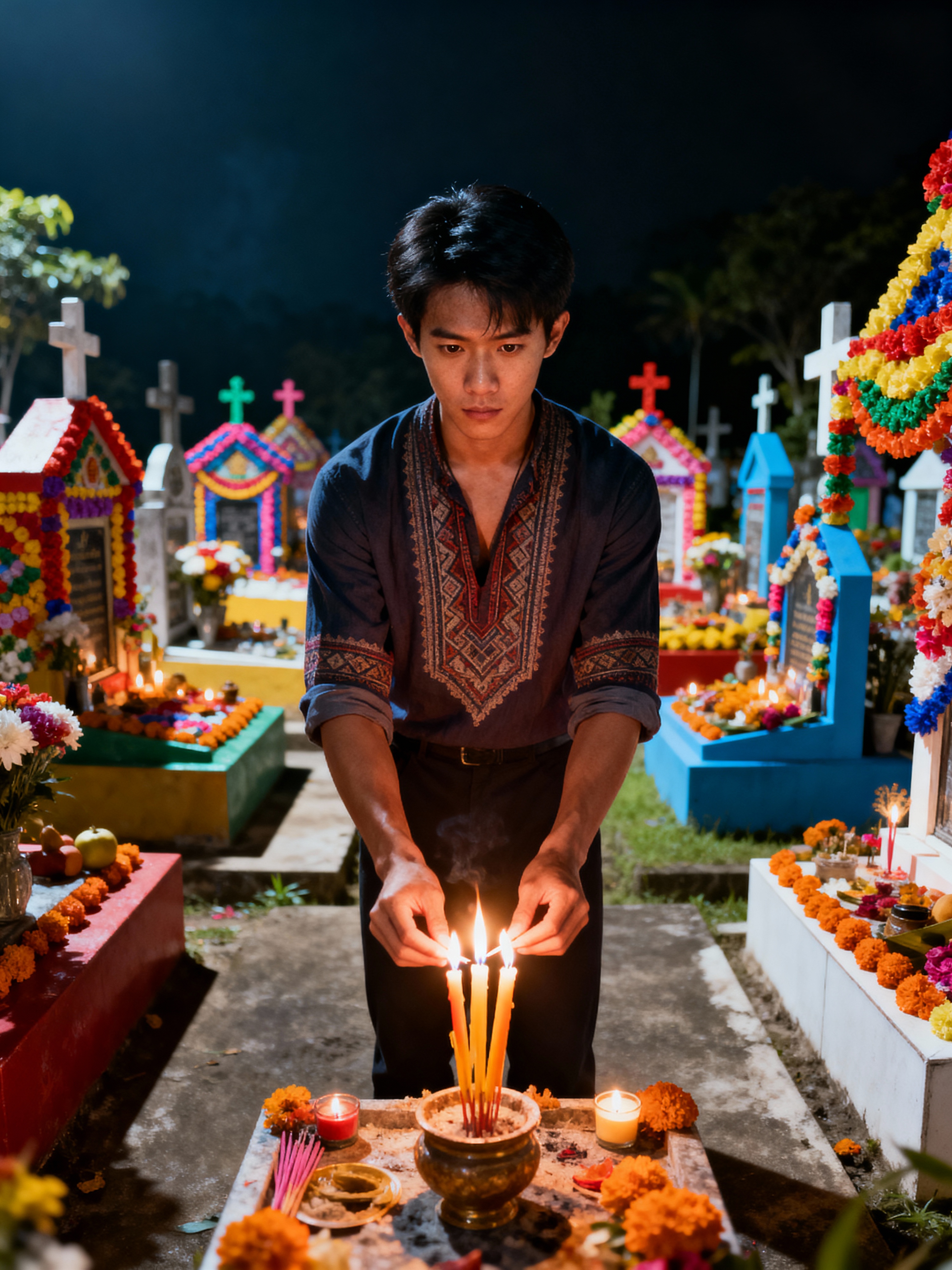 a model with hands lighting candles on an altar, standing out in a beautifully decorated cemetery with colorful graves and offerings