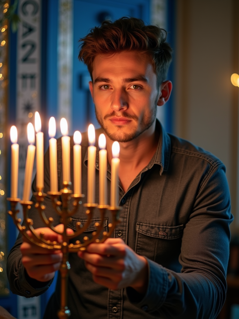 a model with hands lighting the menorah candles, standing out in a beautifully decorated home with blue and silver ornaments and Hebrew calligraphy