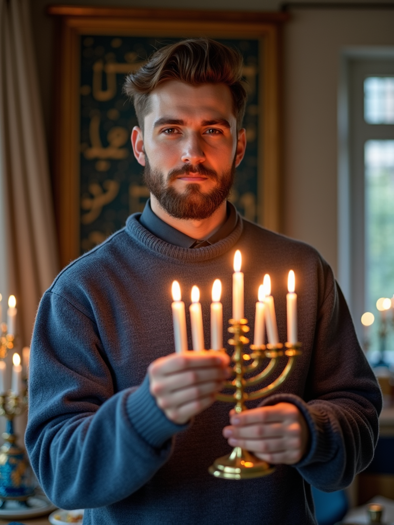 a model with hands lighting the menorah candles, standing out in a beautifully decorated home with blue and silver ornaments and Hebrew calligraphy