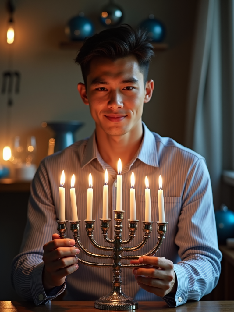 a model with hands lighting the menorah candles, standing out in a beautifully decorated home with blue and silver ornaments and Hebrew calligraphy