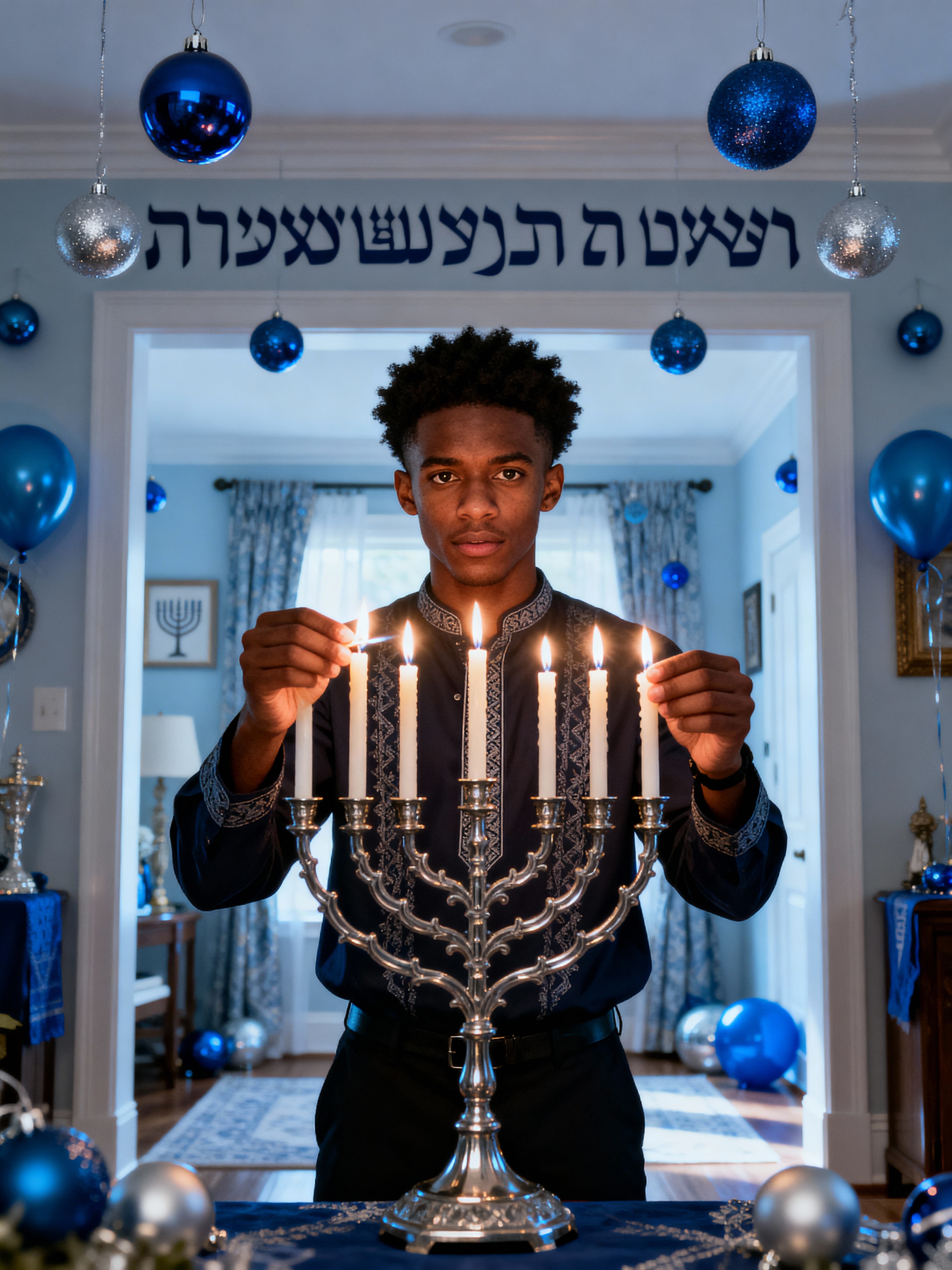 a model with hands lighting the menorah candles, standing out in a beautifully decorated home with blue and silver ornaments and Hebrew calligraphy