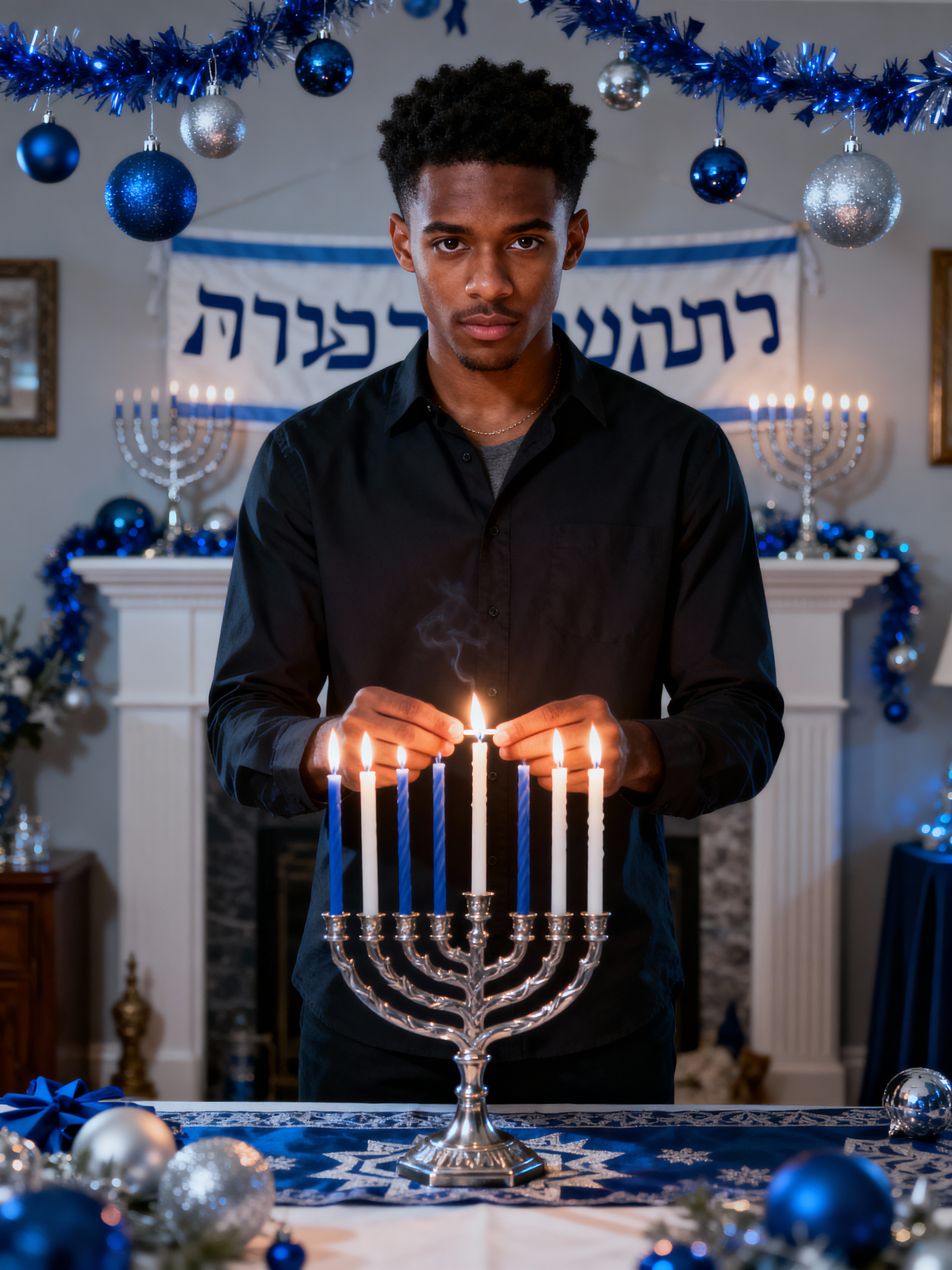 a model with hands lighting the menorah candles, standing out in a beautifully decorated home with blue and silver ornaments and Hebrew calligraphy