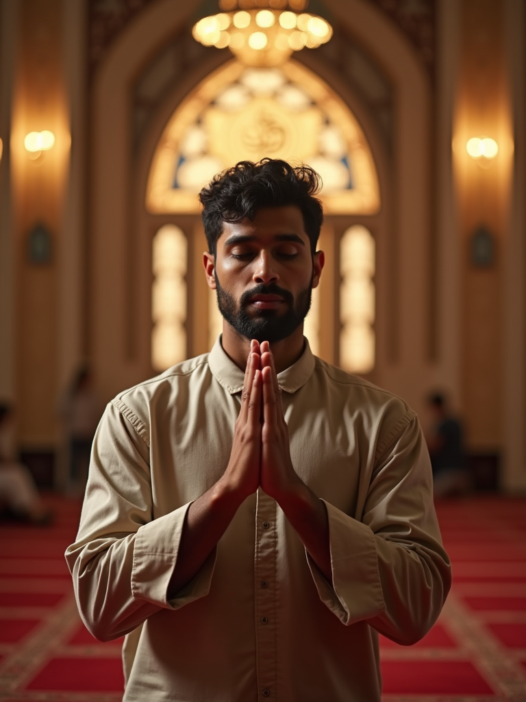 a model with hands raised in dua prayer, standing out in a beautifully decorated prayer space with soft lighting and Islamic calligraphy