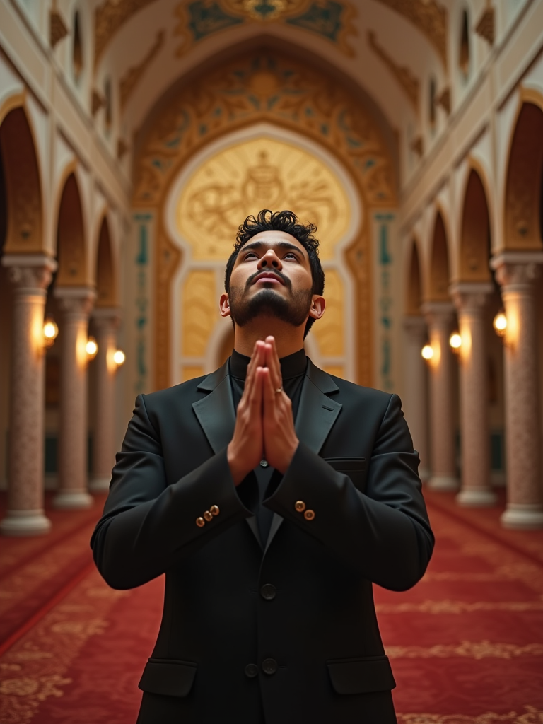 a model with hands raised in dua prayer, standing out in a beautifully decorated prayer space with soft lighting and Islamic calligraphy