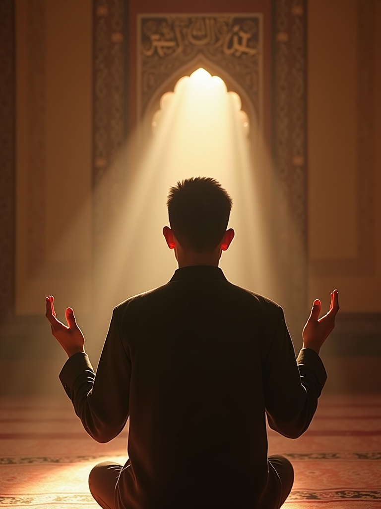 a model with hands raised in dua prayer, standing out in a beautifully decorated prayer space with soft lighting and Islamic calligraphy