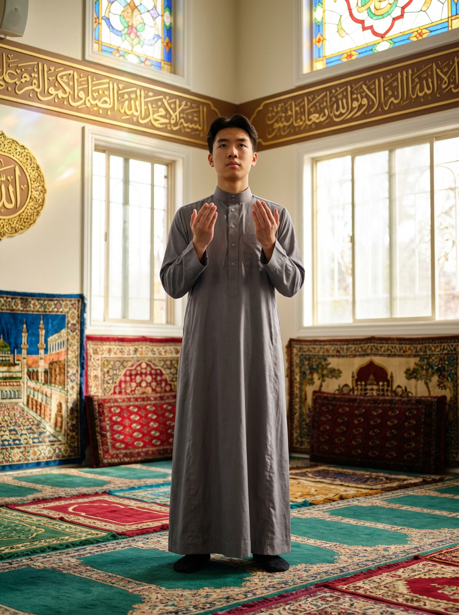 a model with hands raised in dua prayer, standing out in a beautifully decorated prayer space with soft lighting and Islamic calligraphy