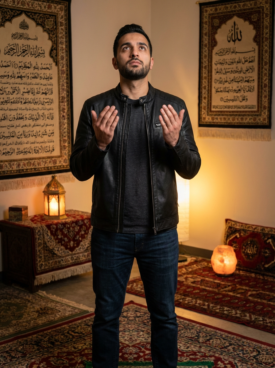 a model with hands raised in dua prayer, standing out in a beautifully decorated prayer space with soft lighting and Islamic calligraphy