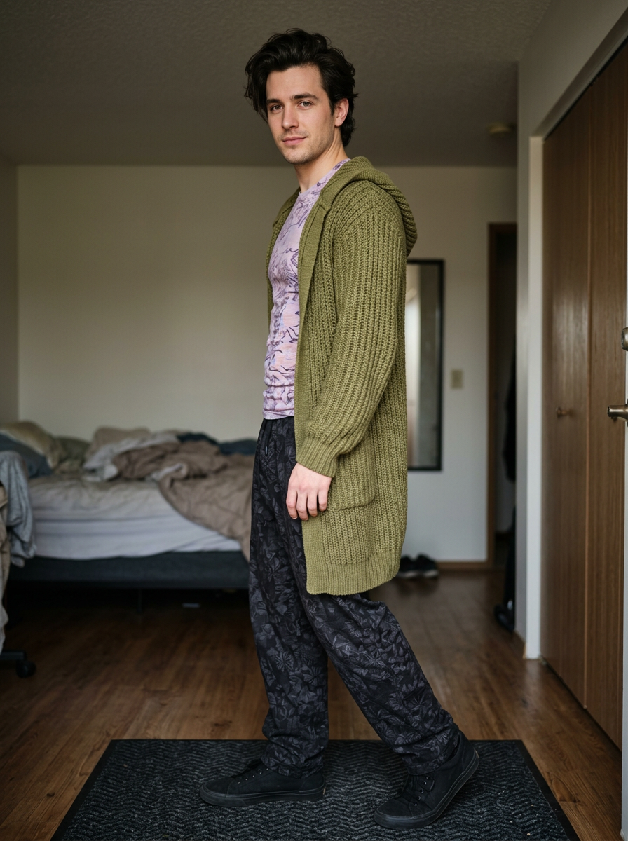 A medium-length portrait of a young male model standing indoors, posing in a casual outfit. He has a dark styled hair hairstyle. He is wearing a light purple and pink patterned fitted t-shirt and dark, loose-fitting pants with a floral or geometric pattern. Over the top, he wears a long, chunky, moss green or olive green ribbed knit cardigan with a hood, which is draped over one shoulder, the fitted t-shirt. He is looking directly towards the camera over his shoulder with a relaxed expression. The background suggests an interior space, possibly a bedroom or hallway, with a glimpse of a bed on the left, a closet or wardrobe on the right, and a dark welcome mat or rug on the floor. The lighting is soft interior light, emphasizing the textures of the knitwear and the patterns of the clothing.