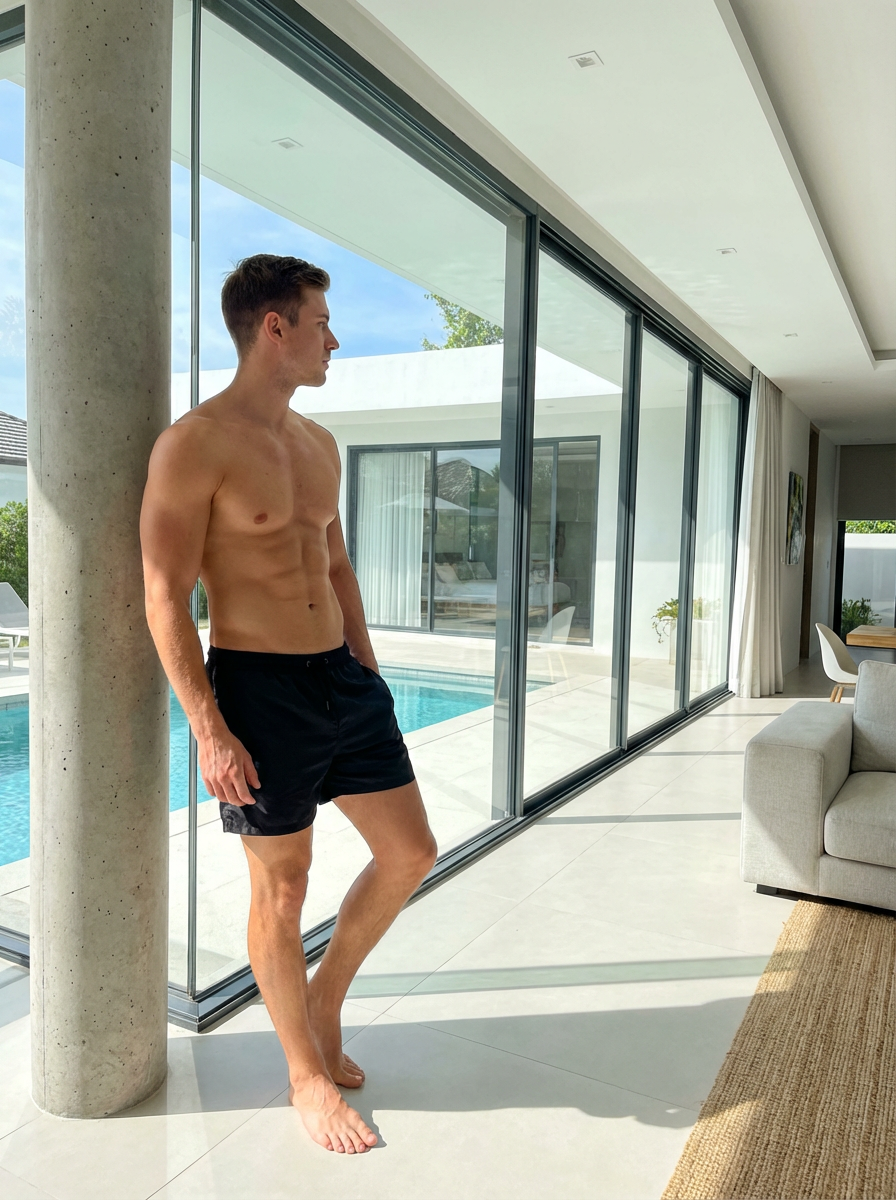 a medium portrait of a model wearing black silk swim shorts in modern luxury design villa living room, instagram photo, fit body futuristic bikini
