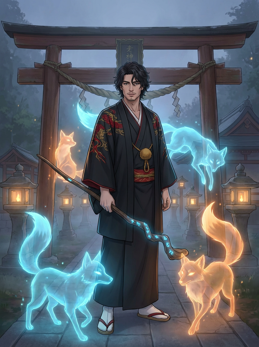 A mystical anime character standing at the entrance of an ancient torii gate surrounded by glowing fox spirits. The model wears a black and red kimono with golden embroidery, gripping a staff with glowing runes. The backdrop is a peaceful Shinto shrine, with lanterns flickering softly in the evening mist. The style is in anime illustration.