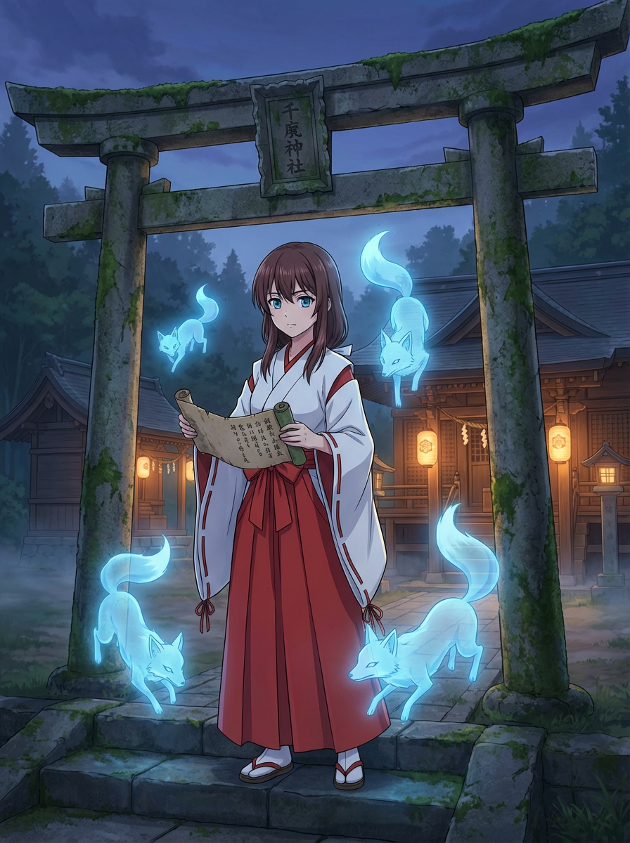 A mystical anime character standing at the entrance of an ancient torii gate surrounded by glowing fox spirits. The model wears a red and white shrine maiden outfit, holding a sacred scroll . The backdrop is a peaceful Shinto shrine, with lanterns flickering softly in the evening mist. The style is in anime illustration.