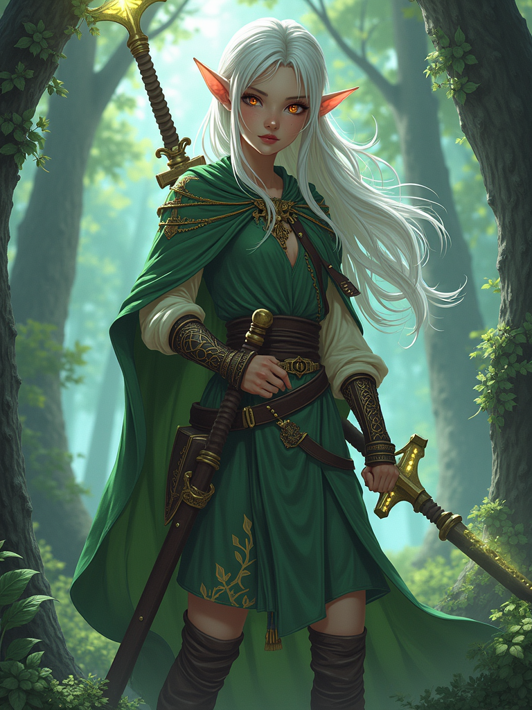 A mystical anime elf character, with pointed ears and glowing magical tattoos, dressed in a regal tunic with enchanted weapons and a strong heroic stance. The setting is a magical woodland landscape.