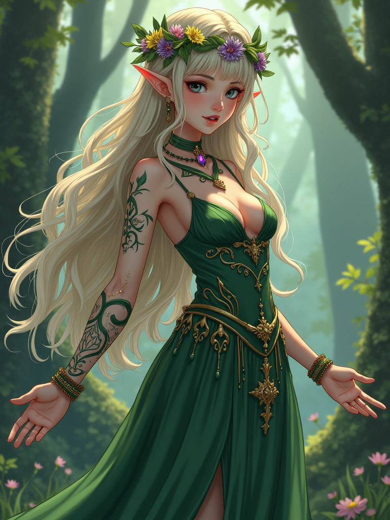 A mystical anime elf character, with pointed ears and glowing magical tattoos, dressed in an elegant forest gown with flower crowns and long flowing hair . The setting is a magical woodland landscape. the style is in anime illustration.
