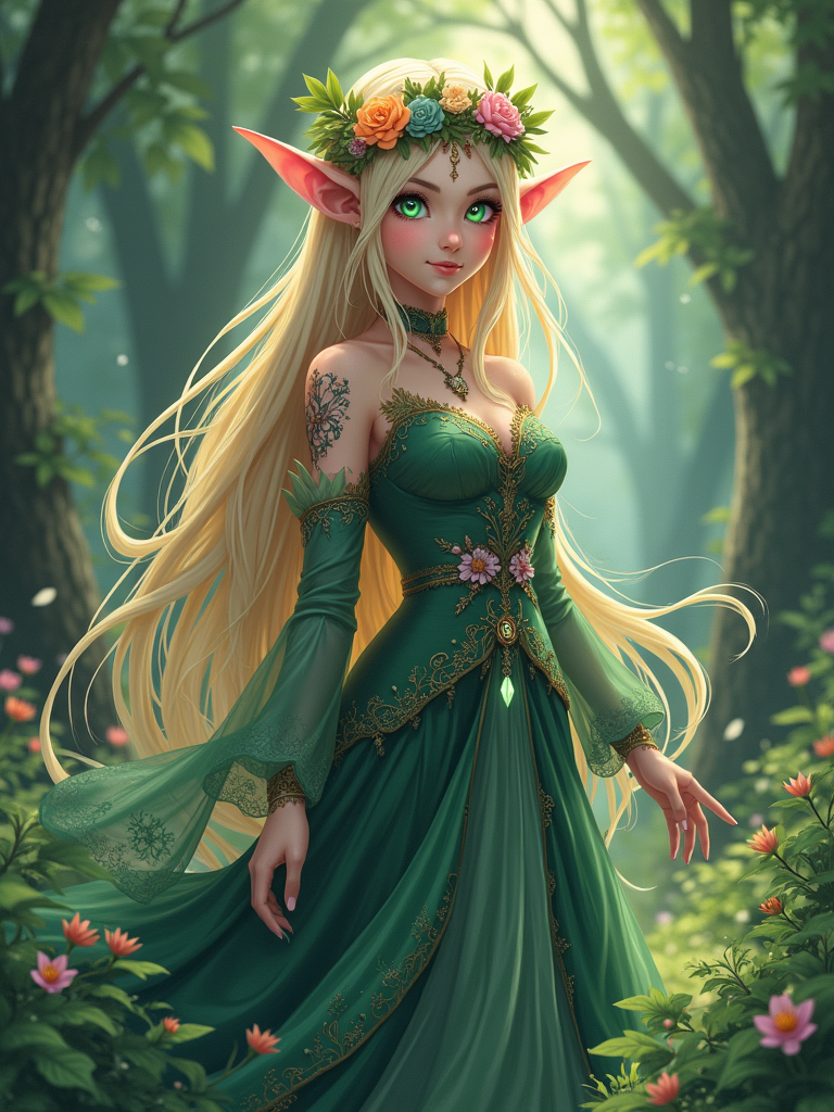 A mystical anime elf character, with pointed ears and glowing magical tattoos, dressed in an elegant forest gown with flower crowns and long flowing hair . The setting is a magical woodland landscape. the style is in anime illustration.