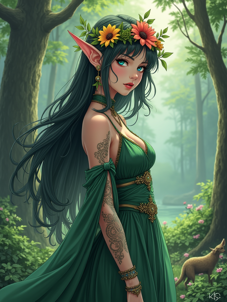 A mystical anime elf character, with pointed ears and glowing magical tattoos, dressed in an elegant forest gown with flower crowns and long flowing hair . The setting is a magical woodland landscape. the style is in anime illustration.