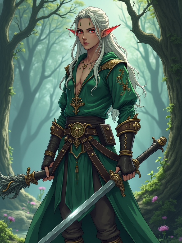 A mystical anime elf character, with pointed ears and glowing magical tattoos, dressed in a regal tunic with enchanted weapons and a strong heroic stance. The setting is a magical woodland landscape. the style is in anime illustration.
