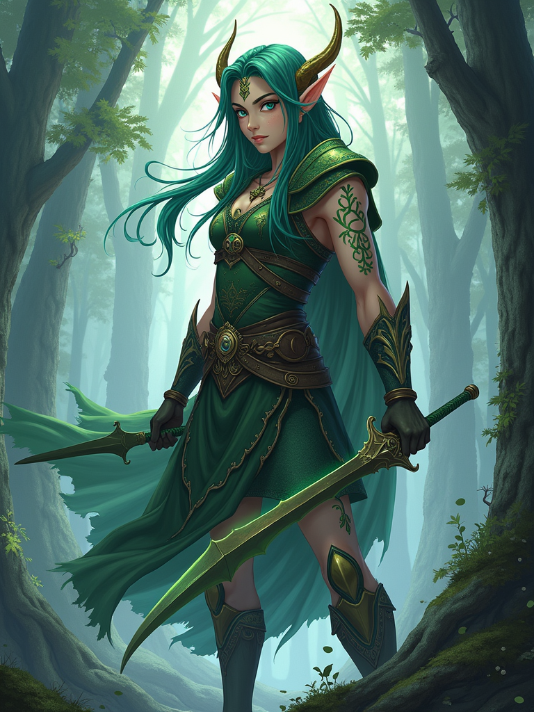 A mystical anime elf character, with pointed ears and glowing magical tattoos, dressed in a regal tunic with enchanted weapons and a strong heroic stance. The setting is a magical woodland landscape. the style is in anime illustration.