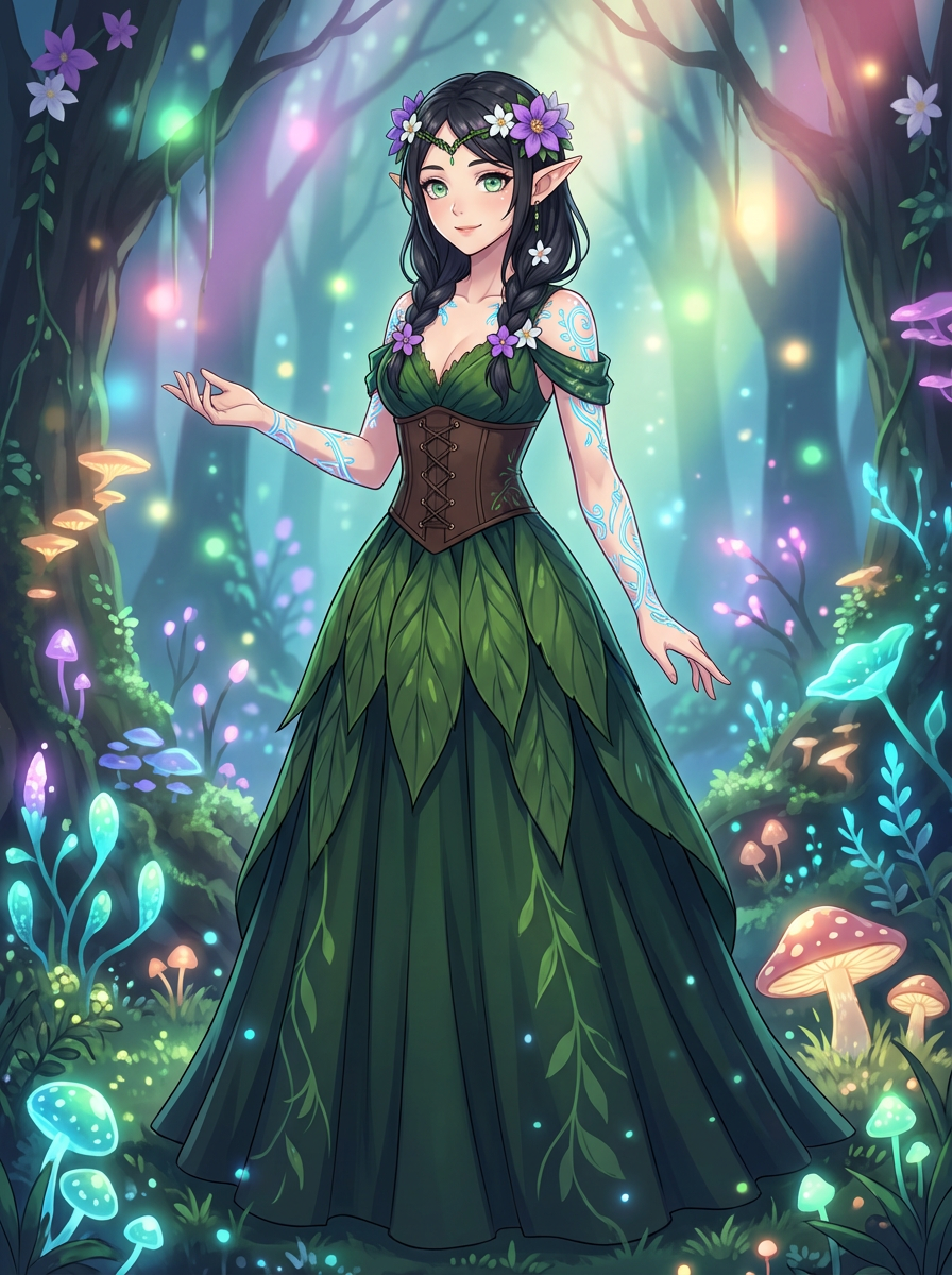 A mystical anime elf character, with pointed ears and glowing magical tattoos, dressed in an elegant forest gown with flower crowns and long flowing hair . The setting is a magical woodland landscape. the style is in anime illustration.