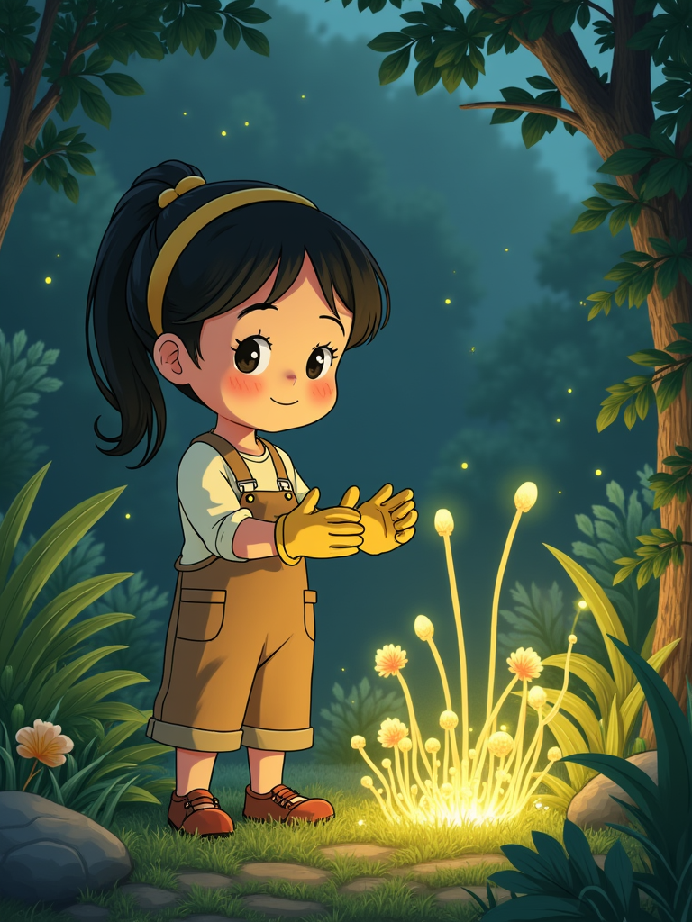 A peaceful line art anime-inspired portrait near a magical garden, the character wearing simple work clothes with garden gloves, tending to mysterious glowing plants. The garden is filled with strange and wonderful creatures. The style is gentle like a line art anime film.