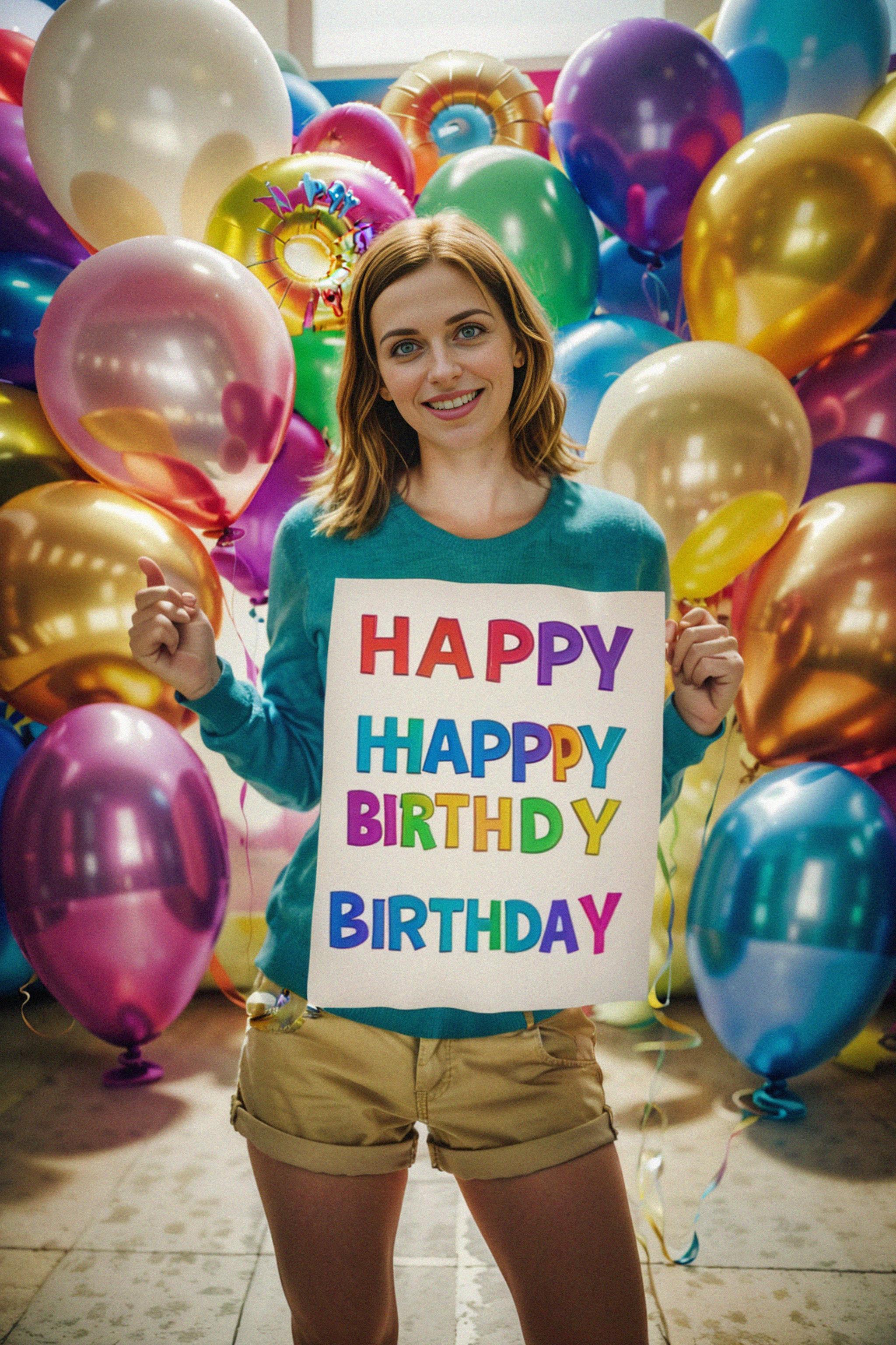 a person surrounded by colorful balloons, holding a "Happy Birthday" sign or banner, radiating the excitement and anticipation of the special day