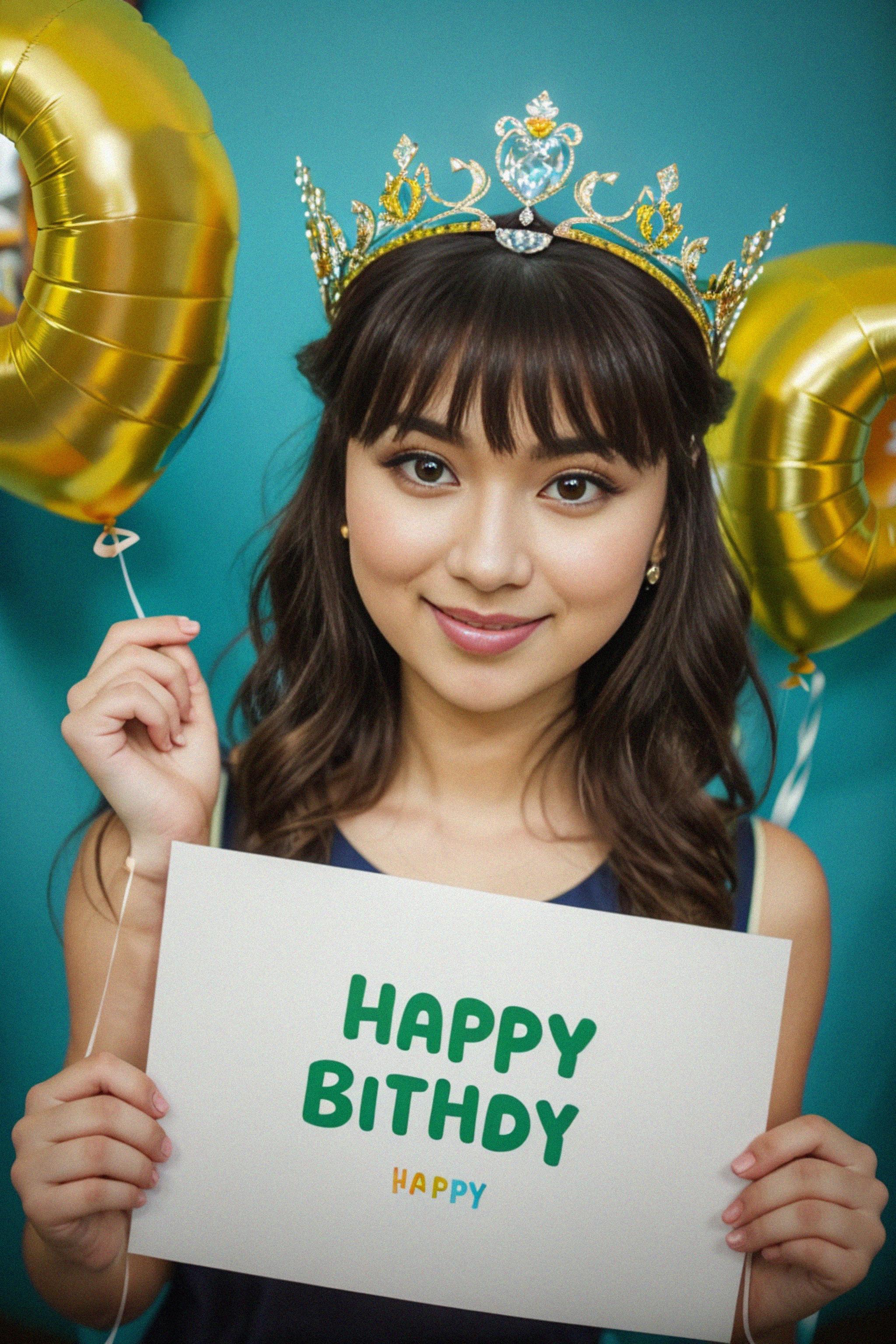 a person wearing a birthday crown or tiara, holding a "Happy Birthday" sign or balloons, radiating elegance and royalty