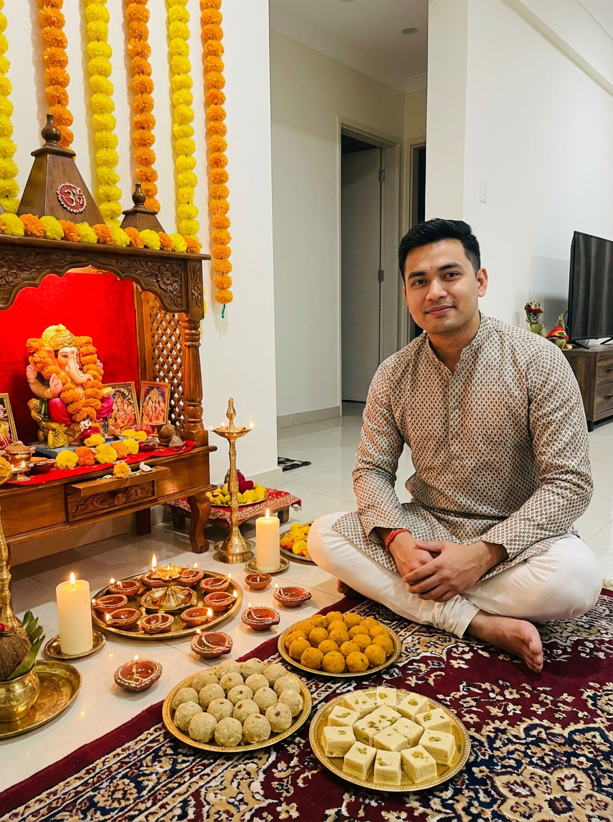 A photo with a model posing around a decorated puja area, with candles, diyas, and traditional Indian sweets on display.