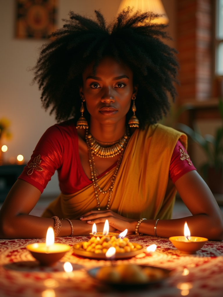 A photo with a model posing around a decorated puja area, with candles, diyas, and traditional Indian sweets on display.