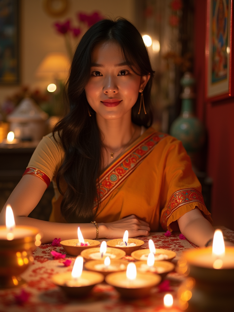 A photo with a model posing around a decorated puja area, with candles, diyas, and traditional Indian sweets on display.